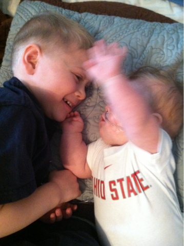 We came home exactly 7 days after surgery. Ethan is doing extremely well!! His incision looks wonderful, its nothing like I had imagined. He has lots of energy. He plays, does tummy time, sits in the bumbo, plays with Eli, rolls back and forth and onto his tummy! The first week home I would constantly watch our video monitor, actually picking it up wondering if he was even breathing. He is actually taking nice smooth shallow breaths. He's hooked up to an pulse oxygen sensor, so I would know if he got into trouble. He actually takes naps instead of sleeping the day away. He is sleeping longer at night. He is still on oxygen when he sleeps, mostly at night for me and car rides. Everything is is just all around SO MUCH BETTER!!!